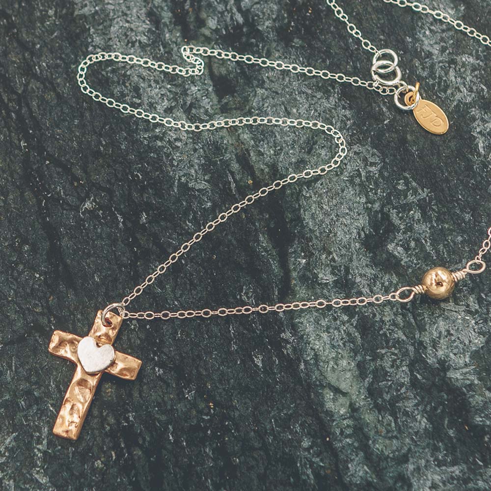 This Collection features handmade Bronze Crosses topped with handmade Fine Silver Hearts....