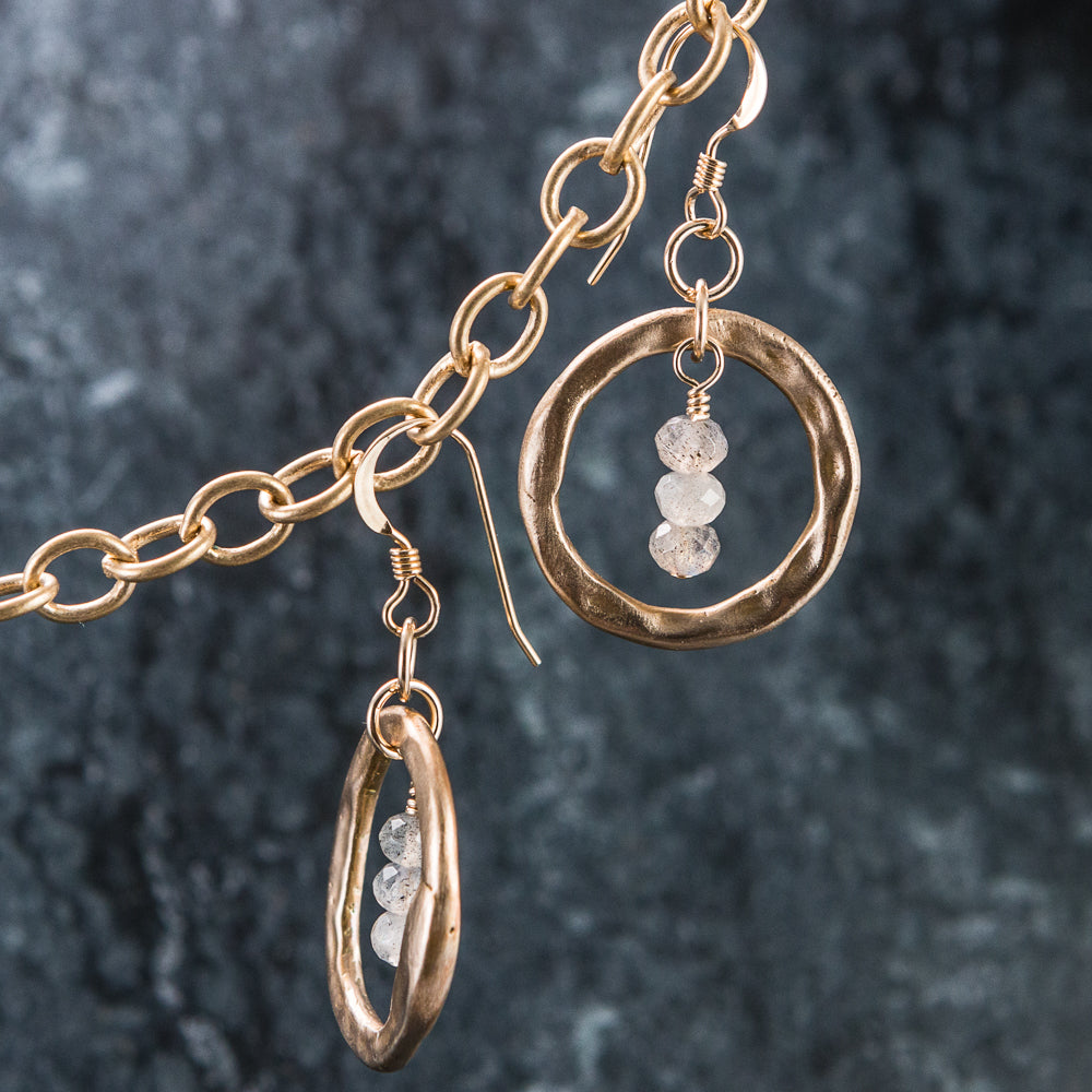 Each earring is composed of 1 - handmade, hammered Bronze Hoop (5/8" outer diameter) and a trio of Labradorite Gemstone Rondelles.