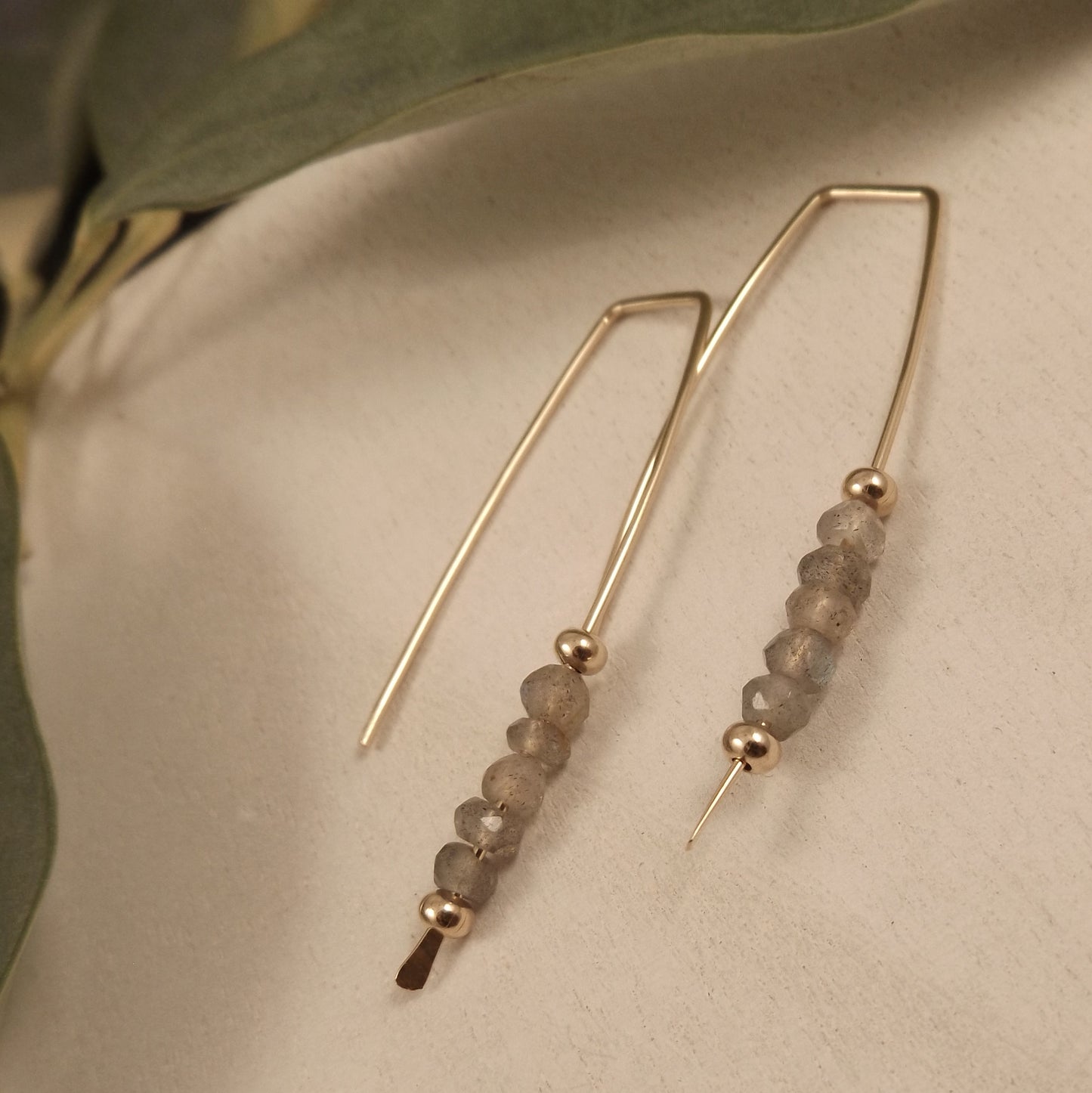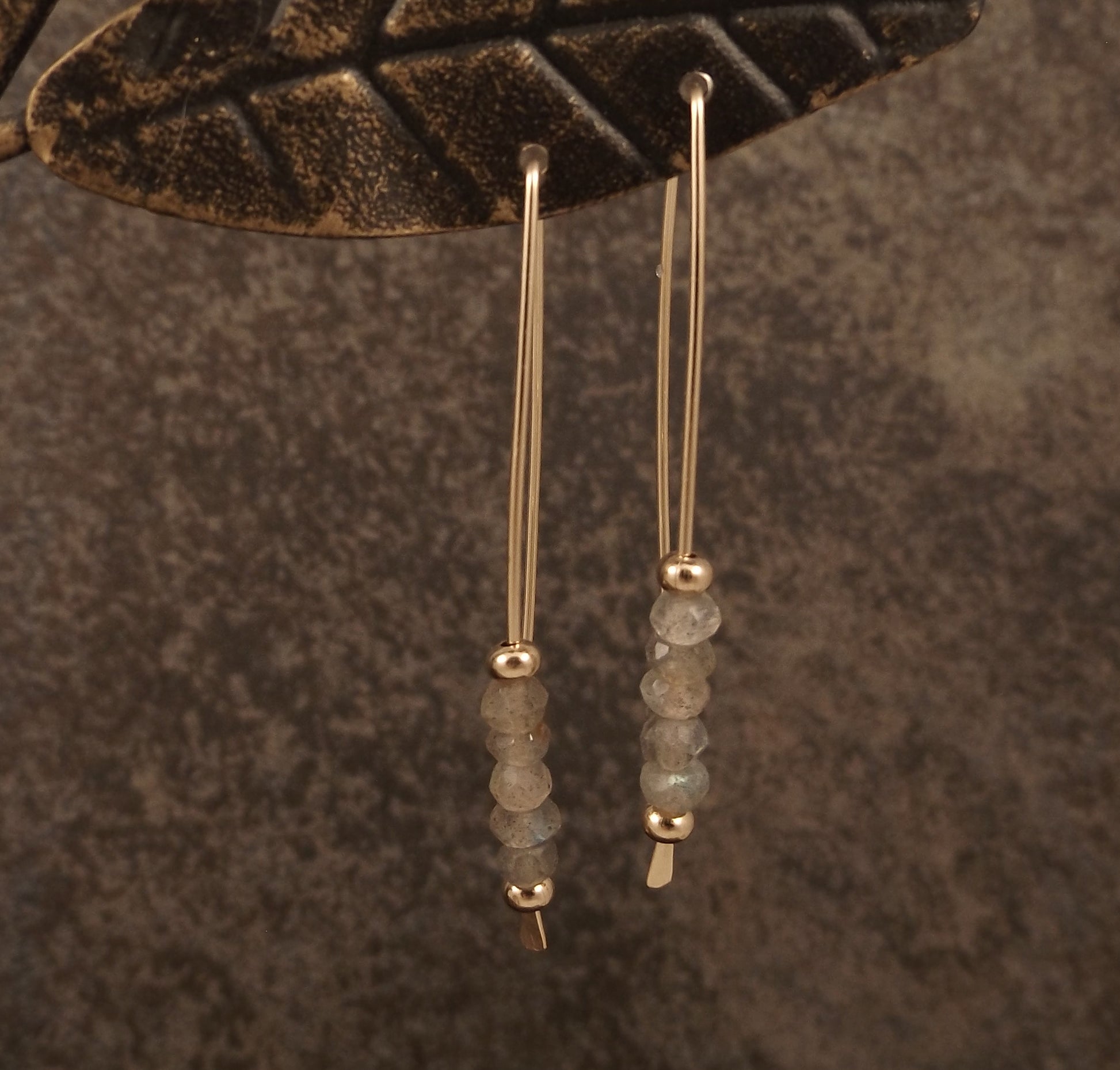 Each earring is composed of 4mm gorgeous Labradorite Faceted Rondelles. They are stung on 14Kt. Gold Filled hand forged ear wires. The sequence of Apatite is capped on each end by 3.6mm 14KT. Gold Fill saucer beads.