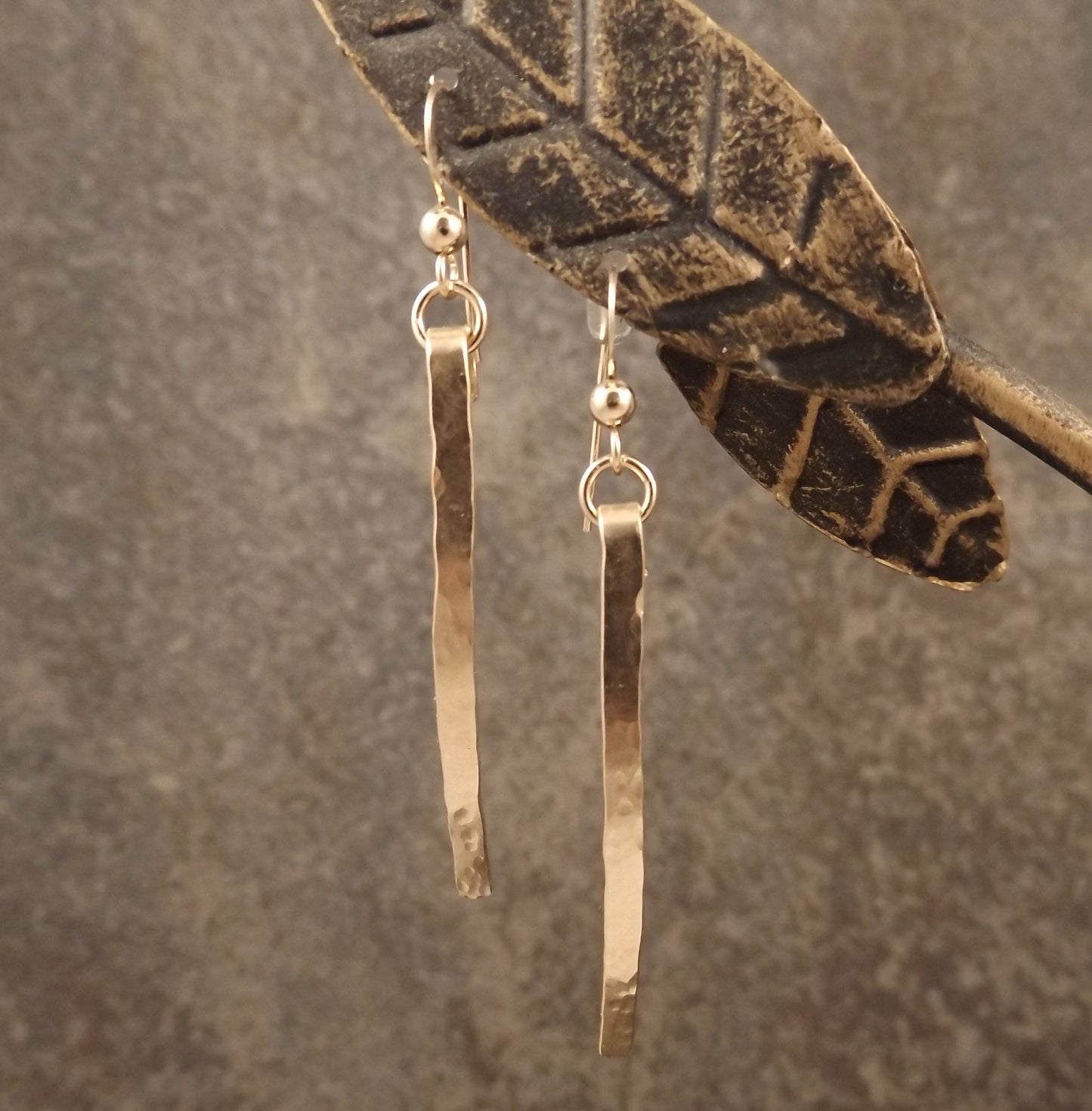 The dangles are hand forged and hammered Gold Filled wire. The bars are approximately 1.75" long.