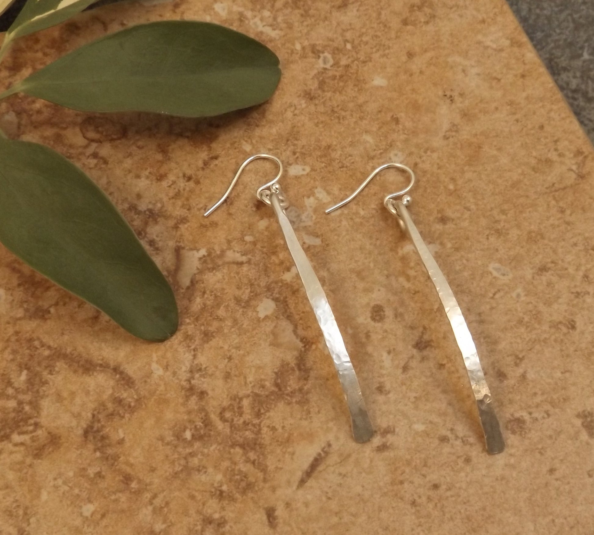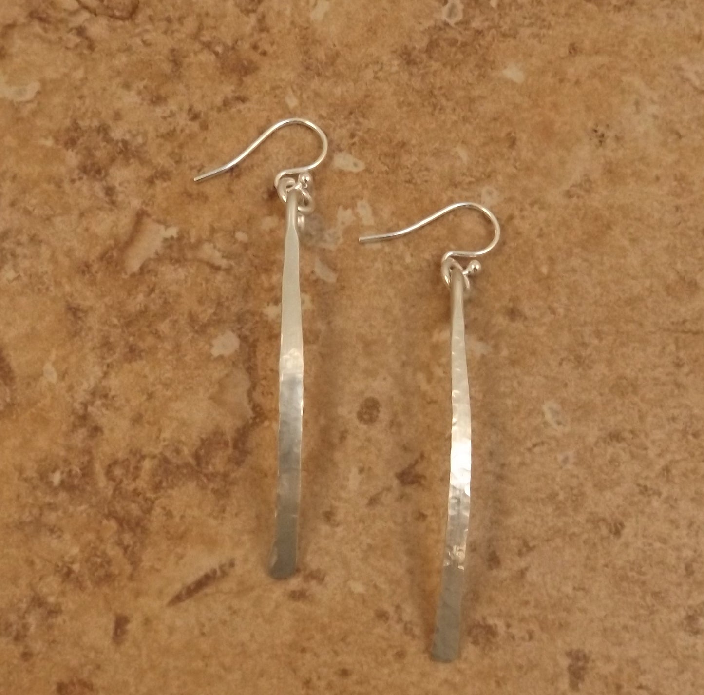Each earring has been created with hand forged Sterling Silver wire. The dangles were carefully hammered and curved to form long simple sticks.