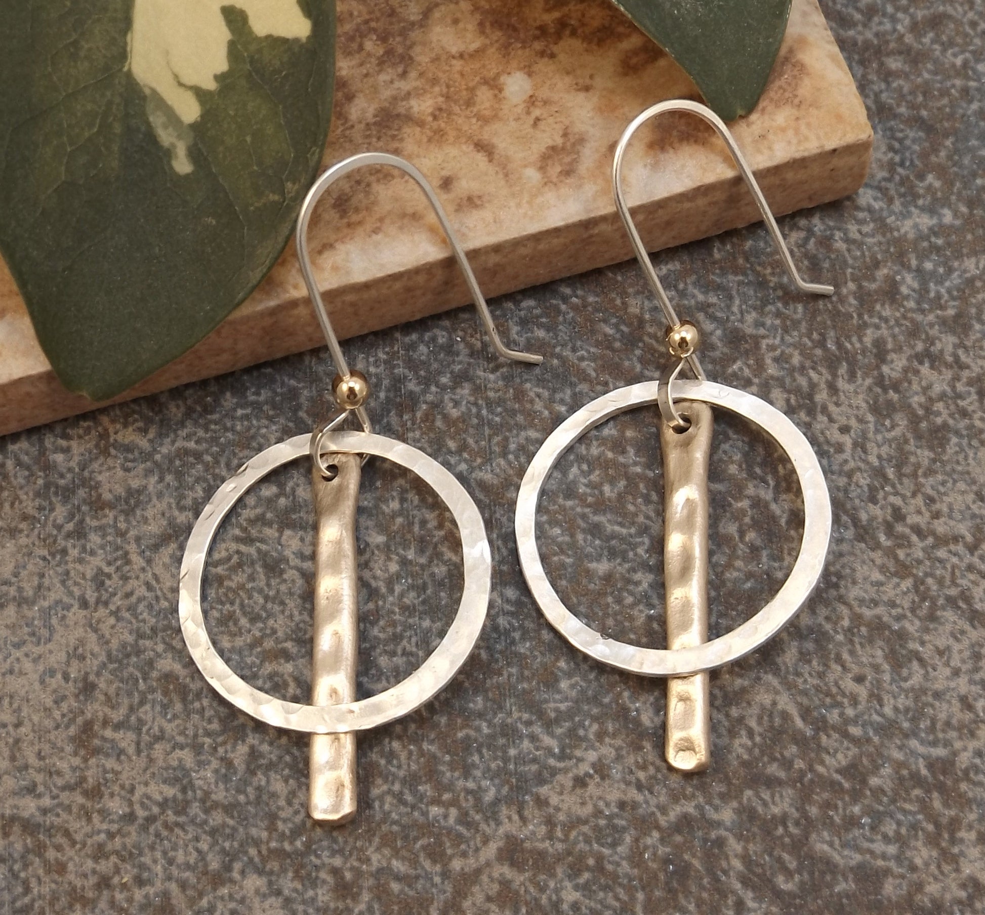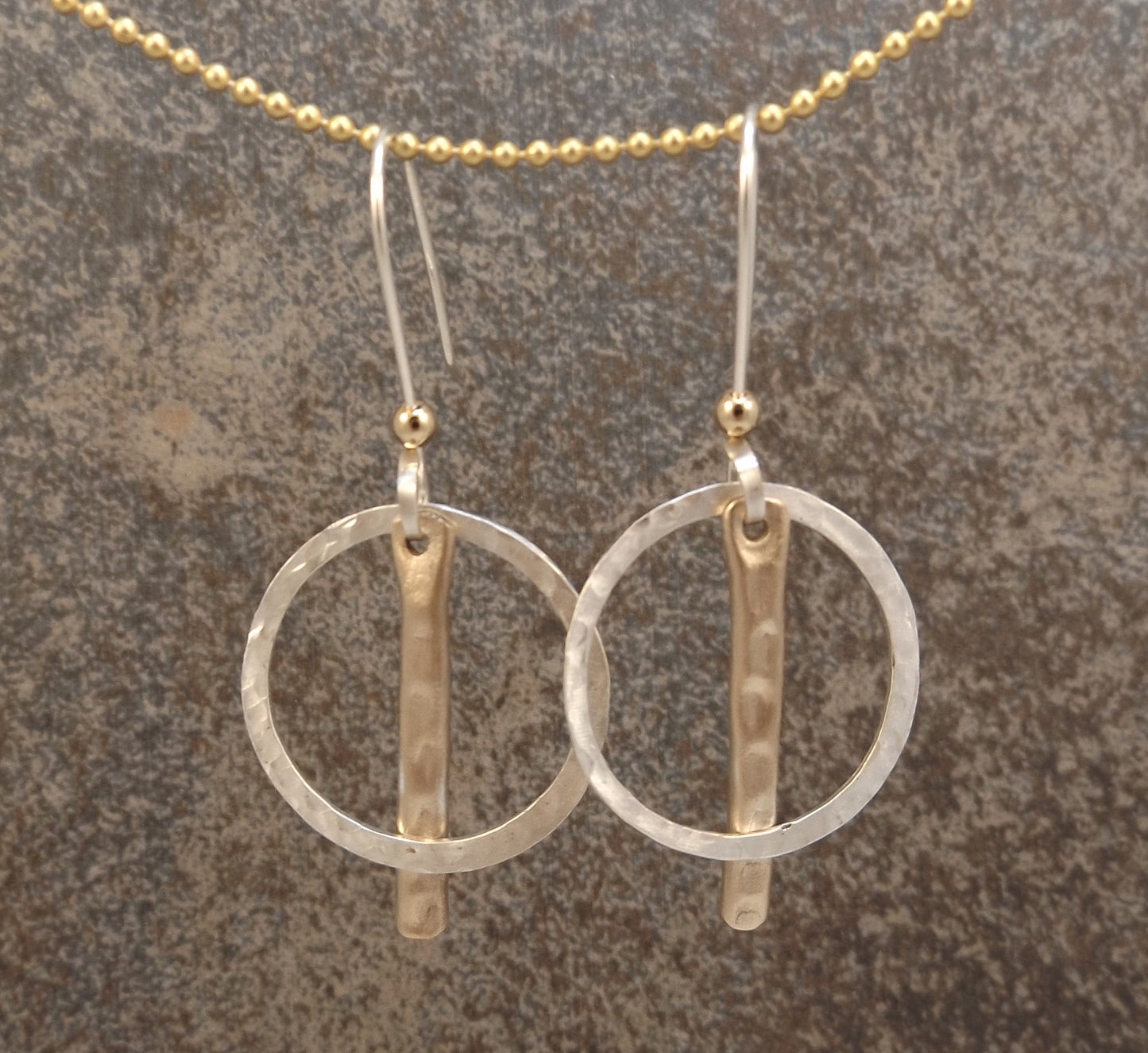 Contrasting with the hoops are handcrafted solid Bronze sticks. These were created with Bronze Metal Clay. Following several steps the metal clay was kiln fired for several hours. The resulting solid bronze sticks were then tumbled and brushed. They are 1-1/4" long.
