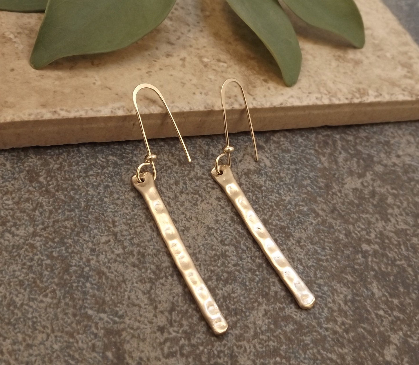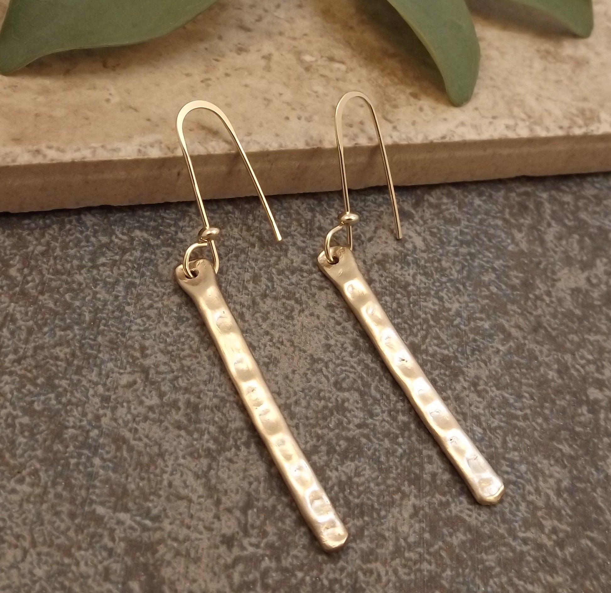 The sticks hang from hand forged 14 KT Gold Filled ear wires. Each has been adorned with a 14KT. Gold Filled saucer bead.