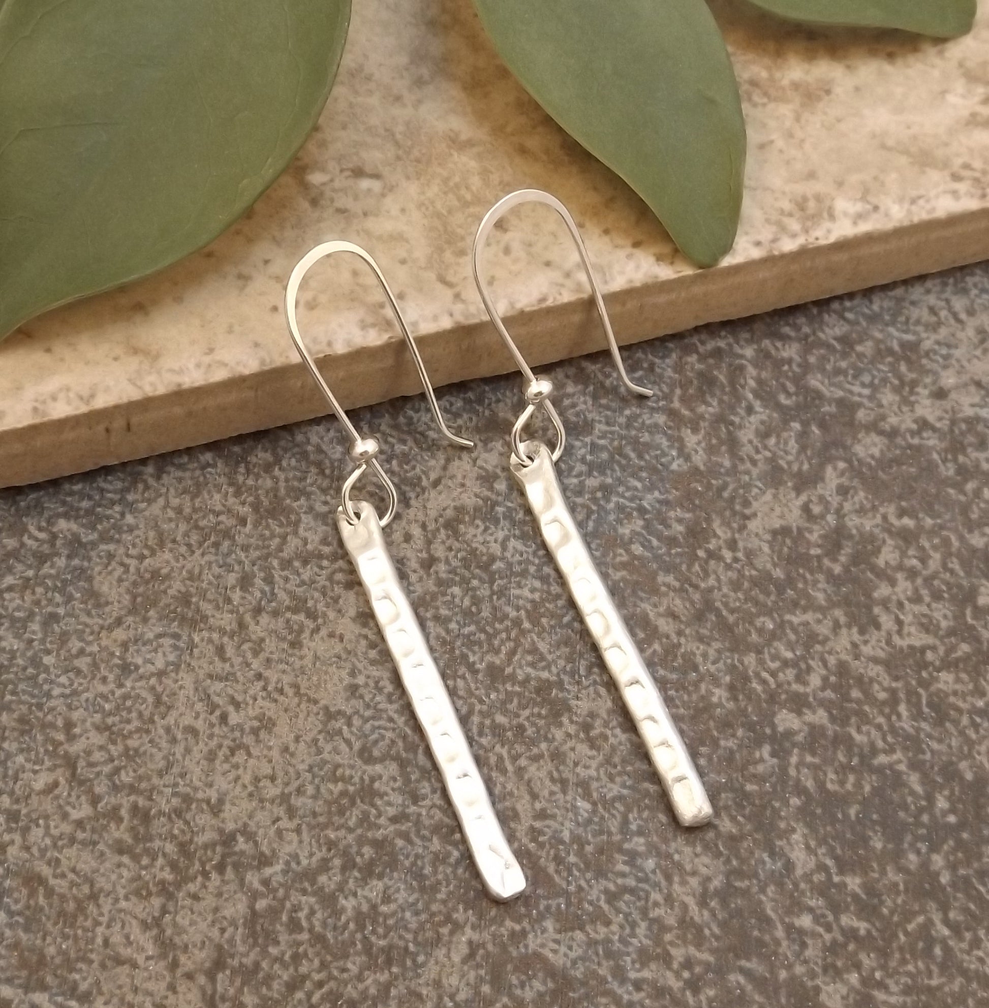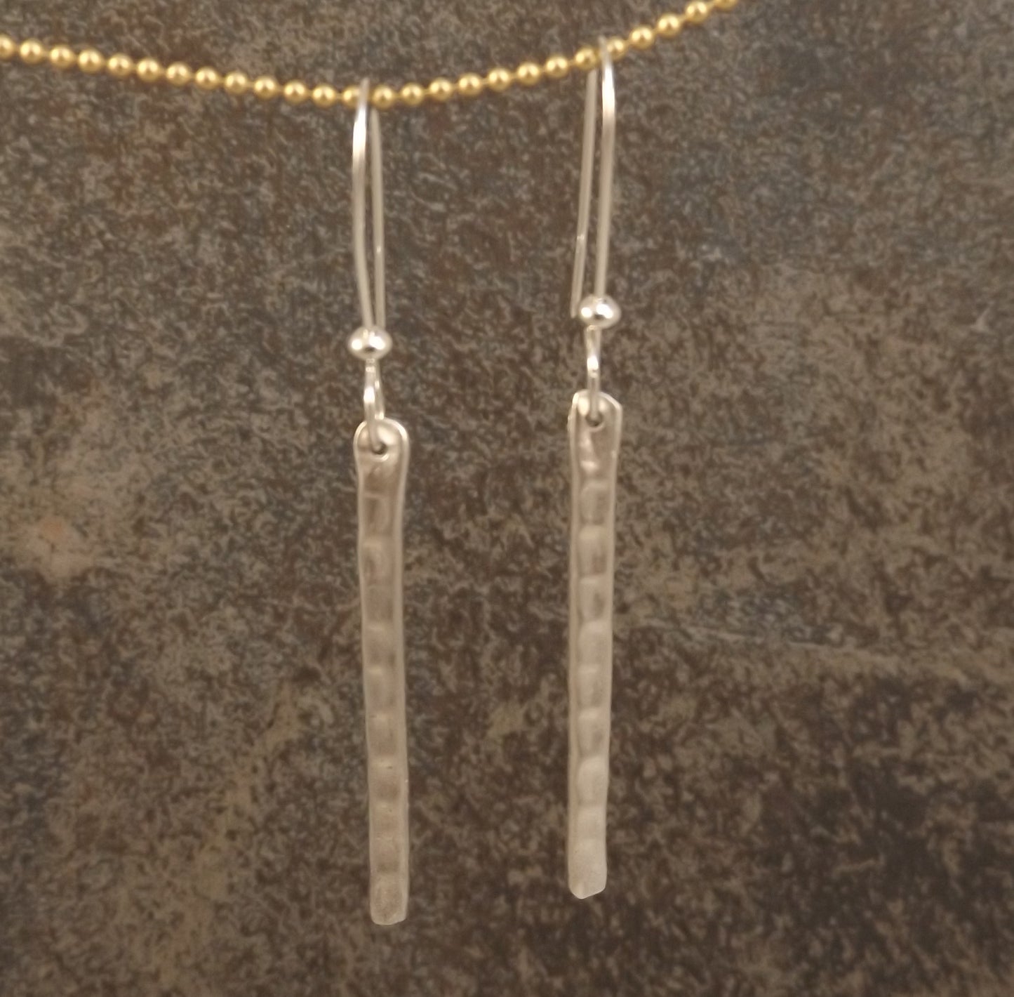 The sticks hang from hand forged Sterling Silver ear wires. Each has been adorned with a Sterling Silver saucer bead.