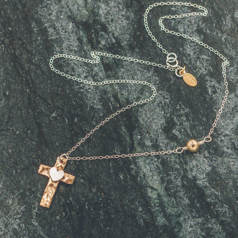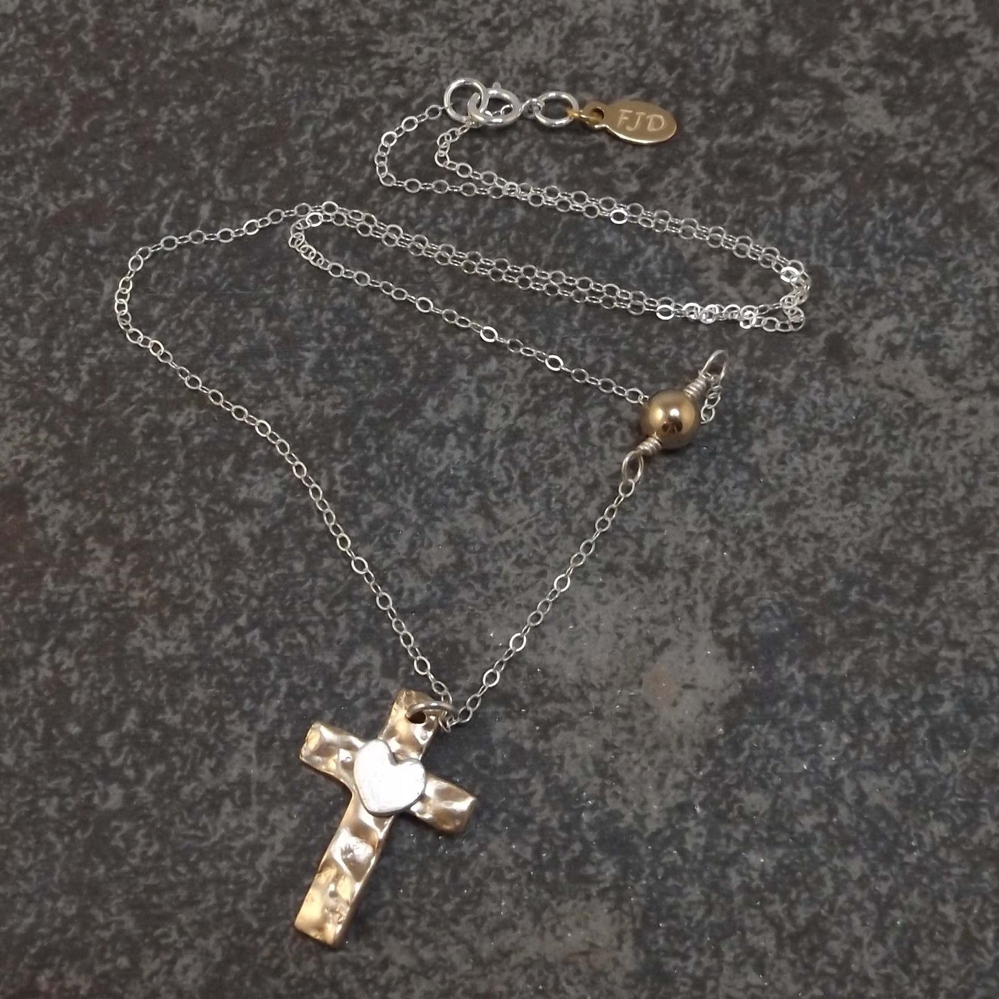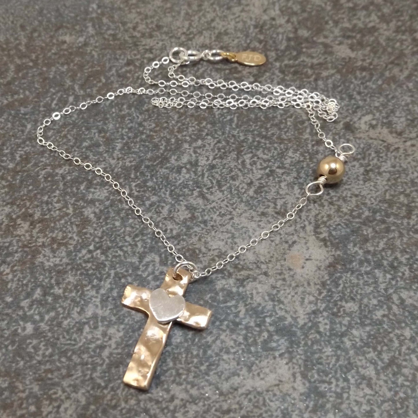The focal is a handcrafted Bronze Cross. This piece was created with Bronze Metal Clay. Following multiple stages, the Metal Clay was kiln fired for several hours. The resulting Solid Bronze Cross was then polished. I have placed a handmade Pure Silver Heart (made with Precious Metal Clay) on top of the cross.