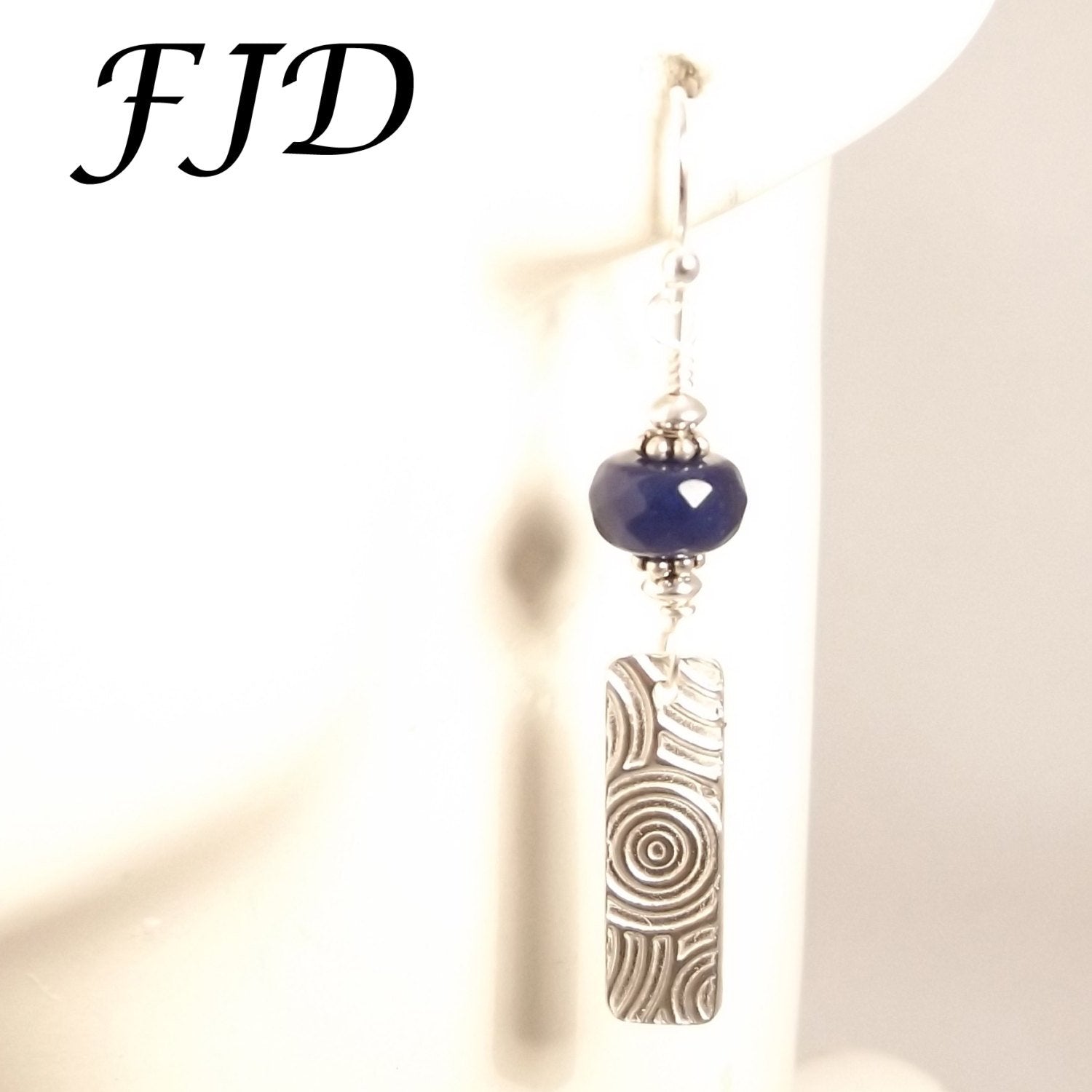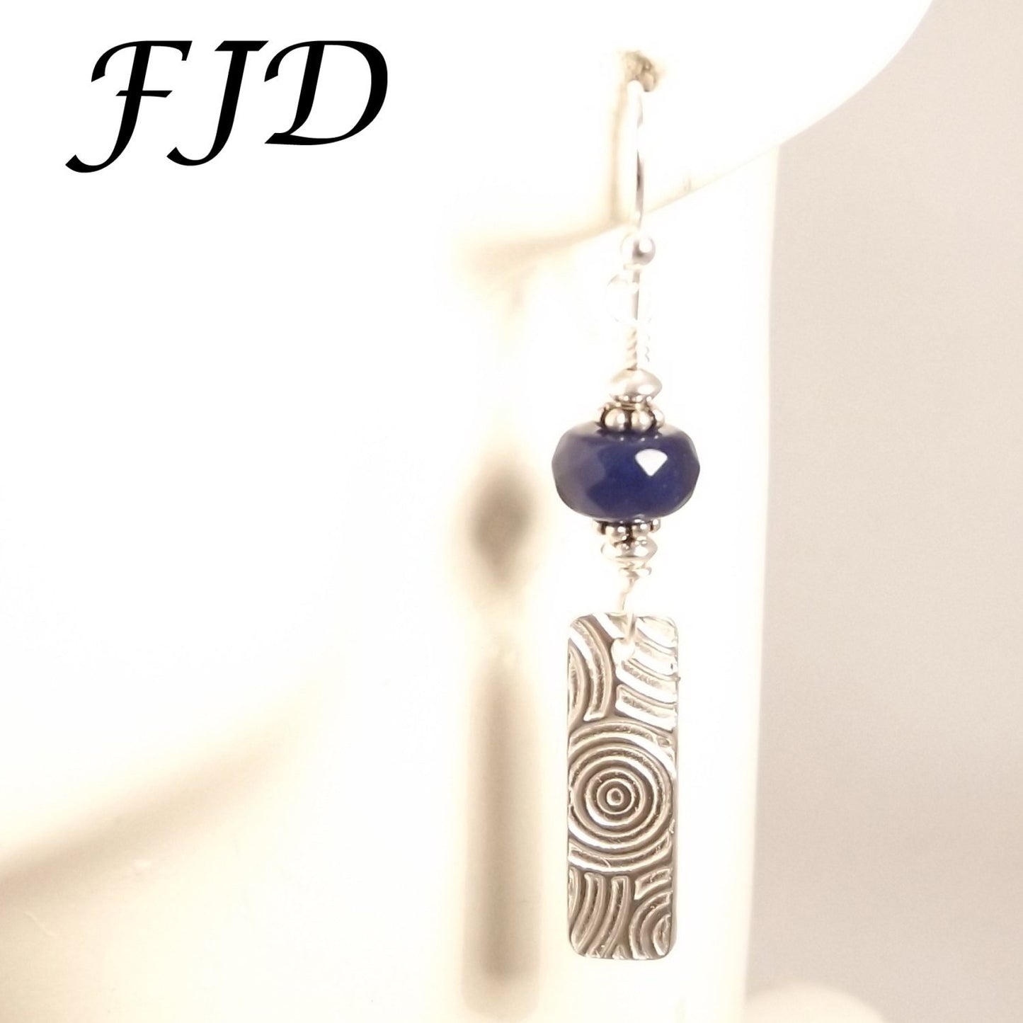The focal of each earring is a hand stamped Fine Silver rectangle charm (1" x 1/4"). These charms started out as Precious Metal Clay (PMC). The PMC was rolled, stamped with an art deco inspired texture, cut, dried, refined and kiln fired. The resulting Fine Silver (99.0% pure silver) was then polished to achieve a bright silver finish.