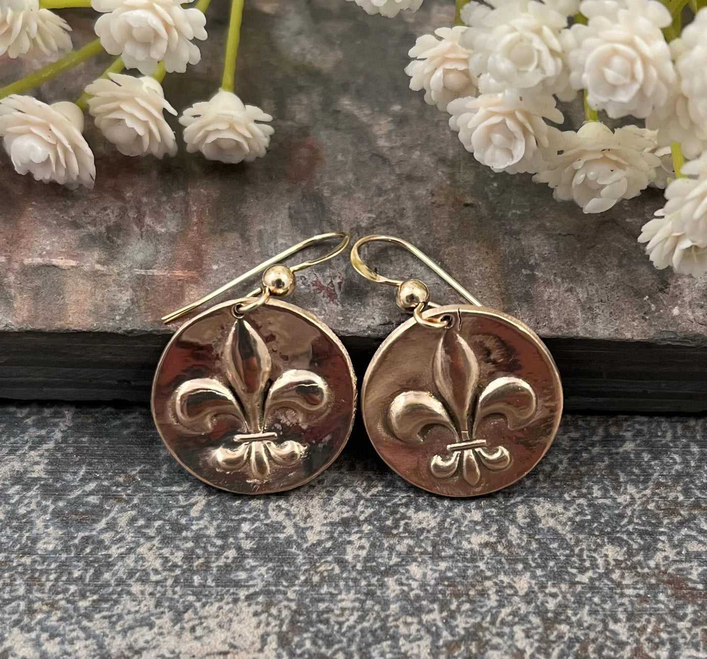 Each raised Fleur de Lis dangle was created with Bronze. The form used to create these pieces was custom designed and is unique to Felicity Jewelry Designs. They are approximately 3/4" in diameter.