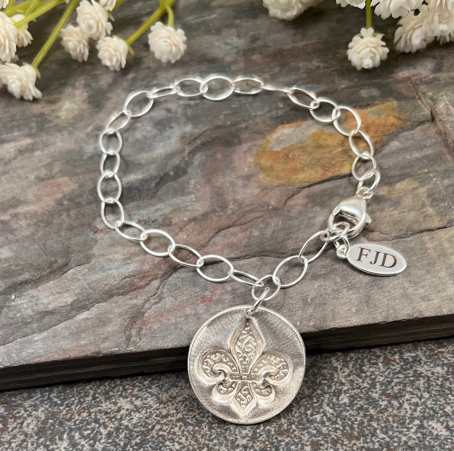 The focal is hand crafted Fine Silver (99.9% Pure Silver) Charm. It is 3/4" in diameter and has been hand polished to a brushed finish. This charm is unique to Felicity Jewelry Designs.