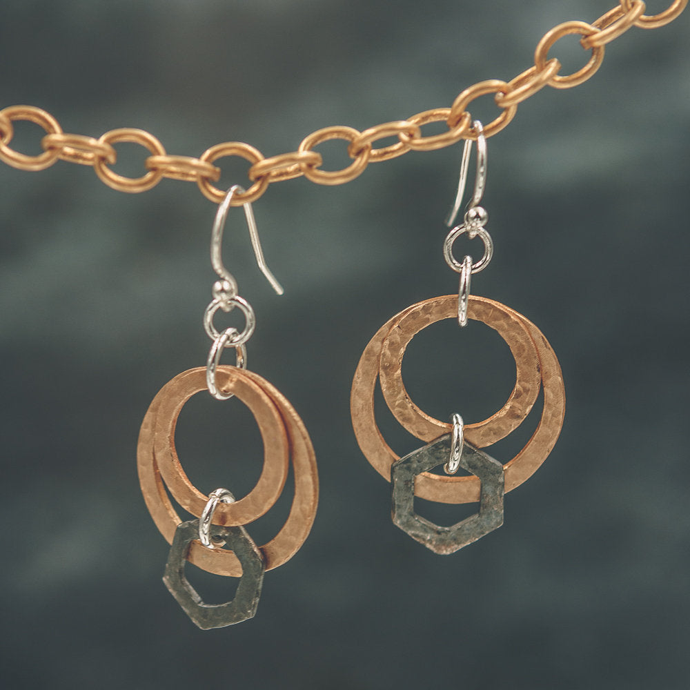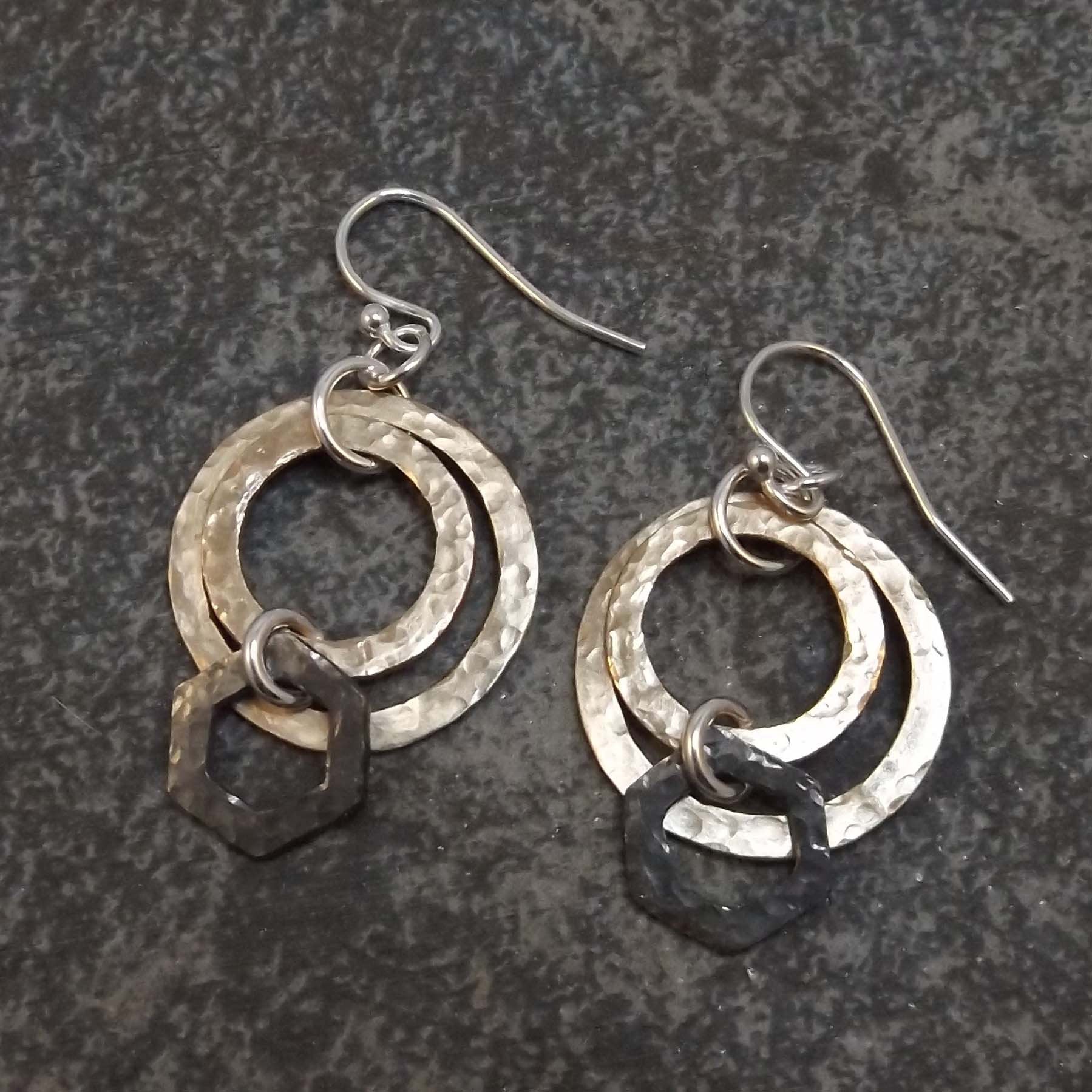 The hexagons were made with Precious Metal Clay. Following multiple steps, the Metal Clay was kiln fired for several hours. The resulting solid Fine Silver (99.9% Pure Silver) hexagons were then burnished, oxidized and hammered.