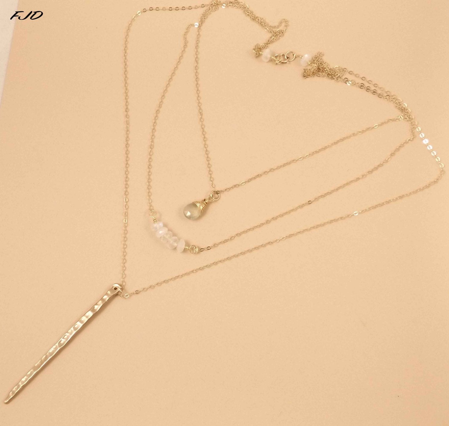 The longest strand is 28" long. A handmade Bronze Stick pendant (approx. 2-1/2" long) hangs from this 14KT. Gold Filled chain. The Bronze pendant was created with Bronze Metal Clay. Following multiple steps, the clay was kiln fired for several hours. The resulting solid bronze piece was then tumbled, hand polished and sealed to reveal and preserve the warm golden hue.