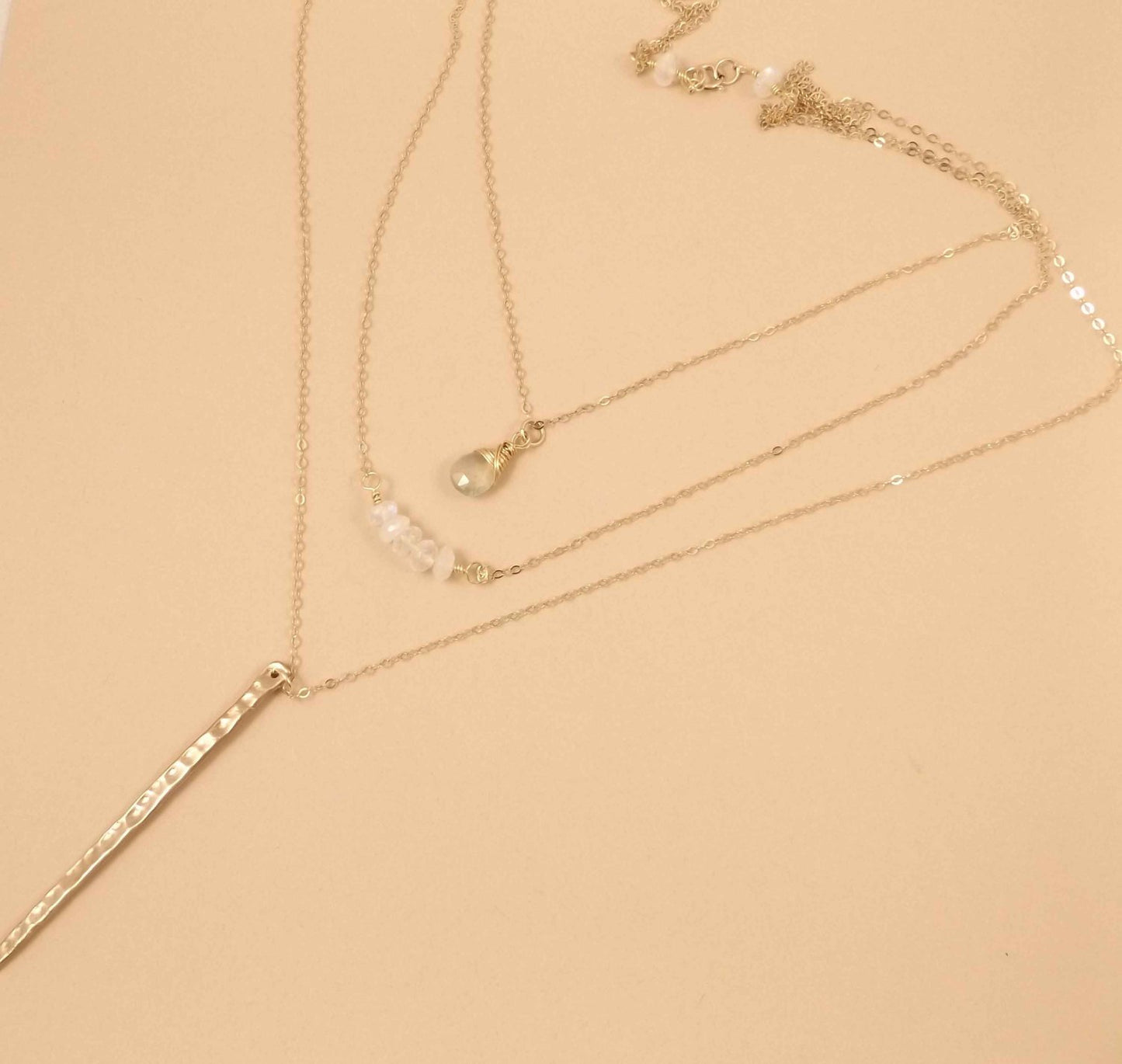The middle strand is approximately 17" long. A grouping of sparkling moonstone is suspended from this chain.