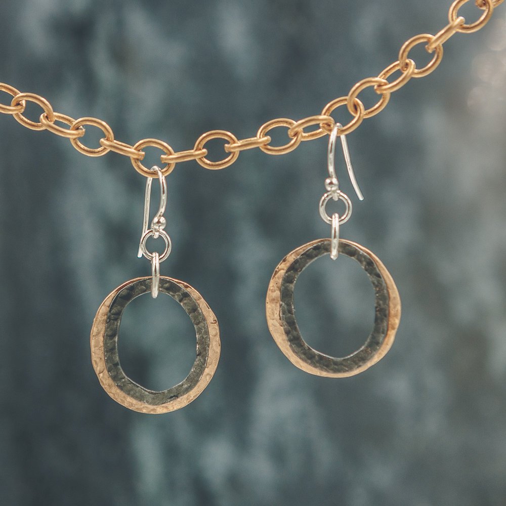 The first hoop on each earring was made with Bronze Metal Clay. Following multiple steps, the Metal Clay was kiln fired for several hours. The resulting solid Bronze hoop was then burnished, polished, hammered and sealed.