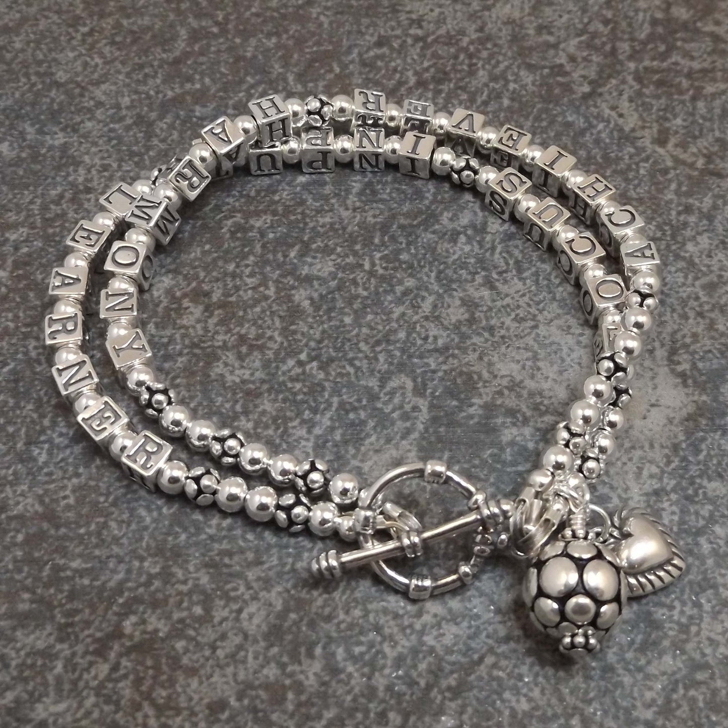 With every bracelet, each strand is composed of 4.5mm Sterling Silver Alphabet beads, 4mm and 5mm Sterling Silver Seamless Beads, Sterling Silver Daisy Spacers and Balinese Silver Spacers. It is finished with a Decorative Sterling Silver Toggle Clasp and two charms (1 - Genuine Balinese Silver Bead and 1 - Sterling Silver Heart Charm). Please note that there might be slight variation with respect to the type of Balinese spacers used. Use is based on availablity. In all cases, the components used are of good quality and are genuine Sterling Silver.