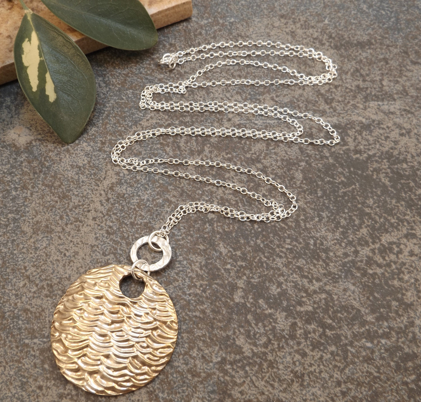 The focal is a handcrafted solid Bronze pendant (1-1/4" diameter). It sways beneath a handcrafted Fine Silver ring (1/2 outer diameter). Both of these pieces depict a beautifully detailed wave pattern.