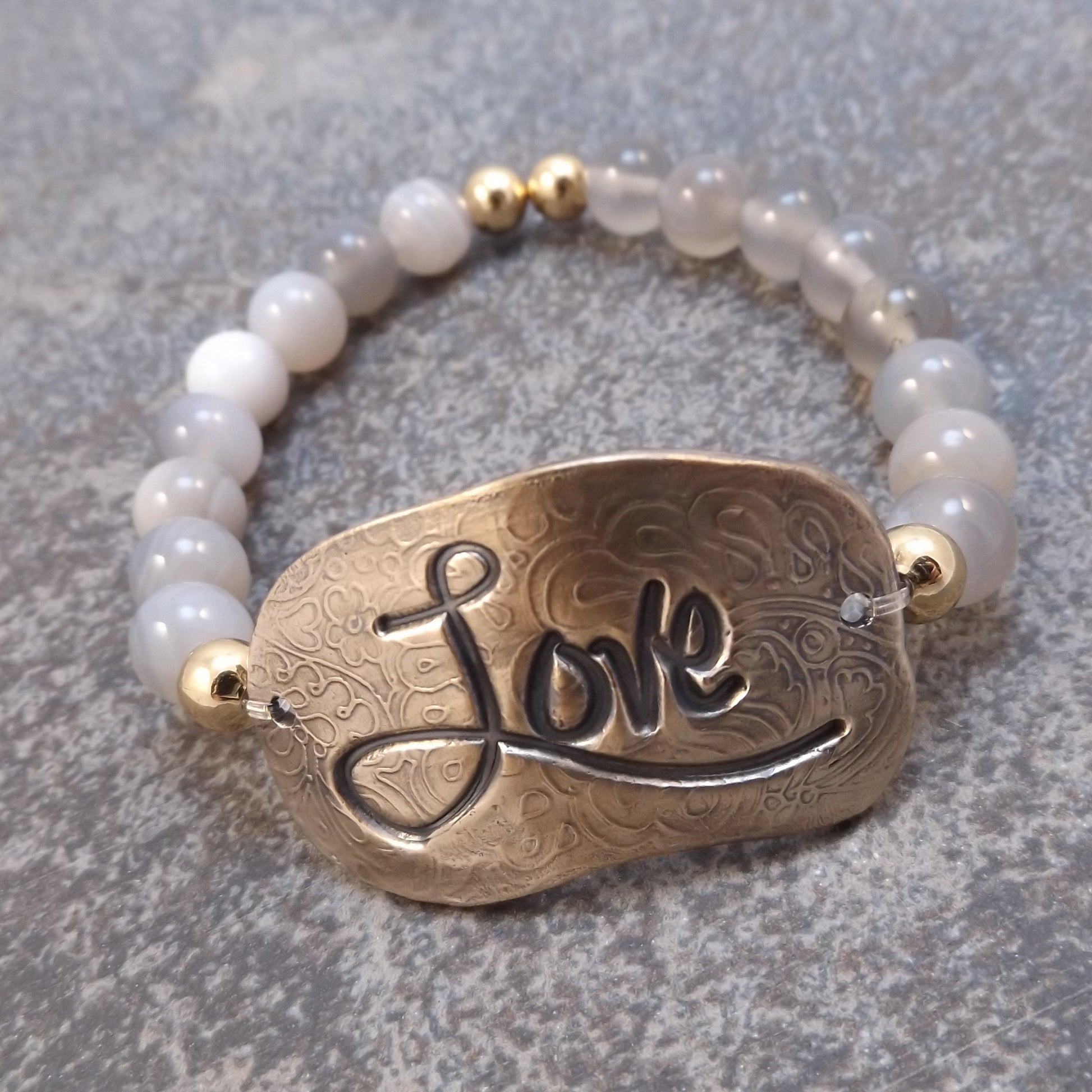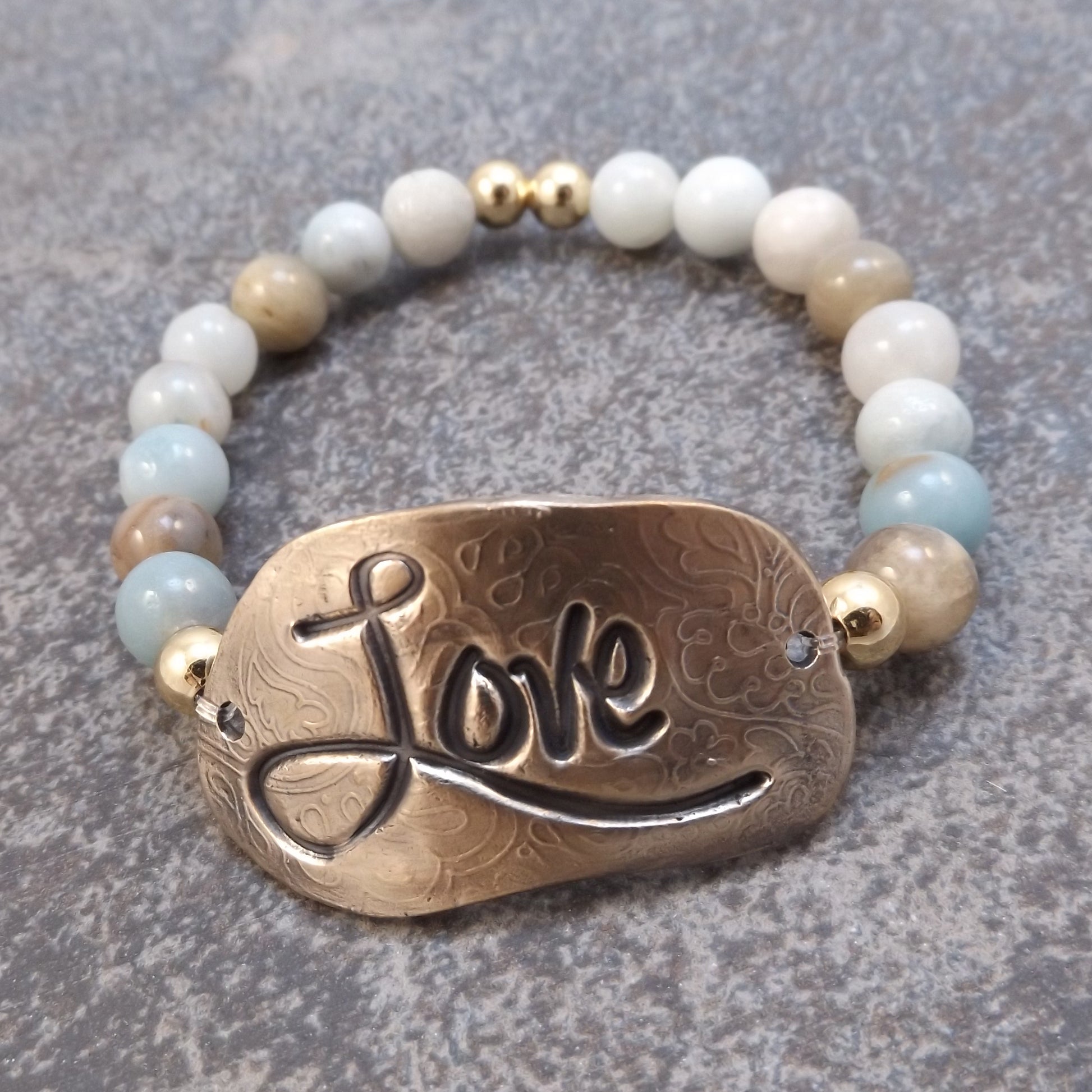 The focal of each piece is a hand formed solid bronze bracelet plate (1-5/8" x 3/4"). This plate was made with Bronze Clay (BRONZclay). The clay was conditioned, rolled, stamped with an Inspirational word, hand-shaped, dried, refined and kiln fired for several hours. The resulting solid bronze plate was then polished, antiqued and polished again.
