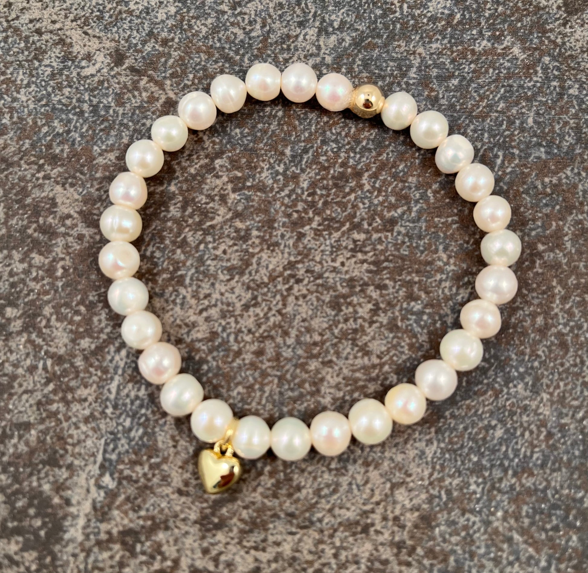 This piece is composed of 6-7mm Freshwater Pearl beads that are complemented with a 6mm Gold Filled Bead, and a sweet Gold Filled heart charm. So cute!