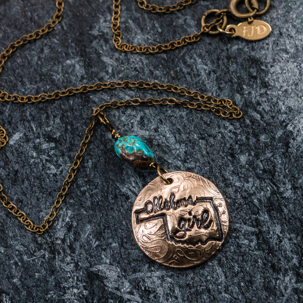 The pendant is suspended from a gorgeous Turquoise Nugget bead and an oxidized brass necklace.
