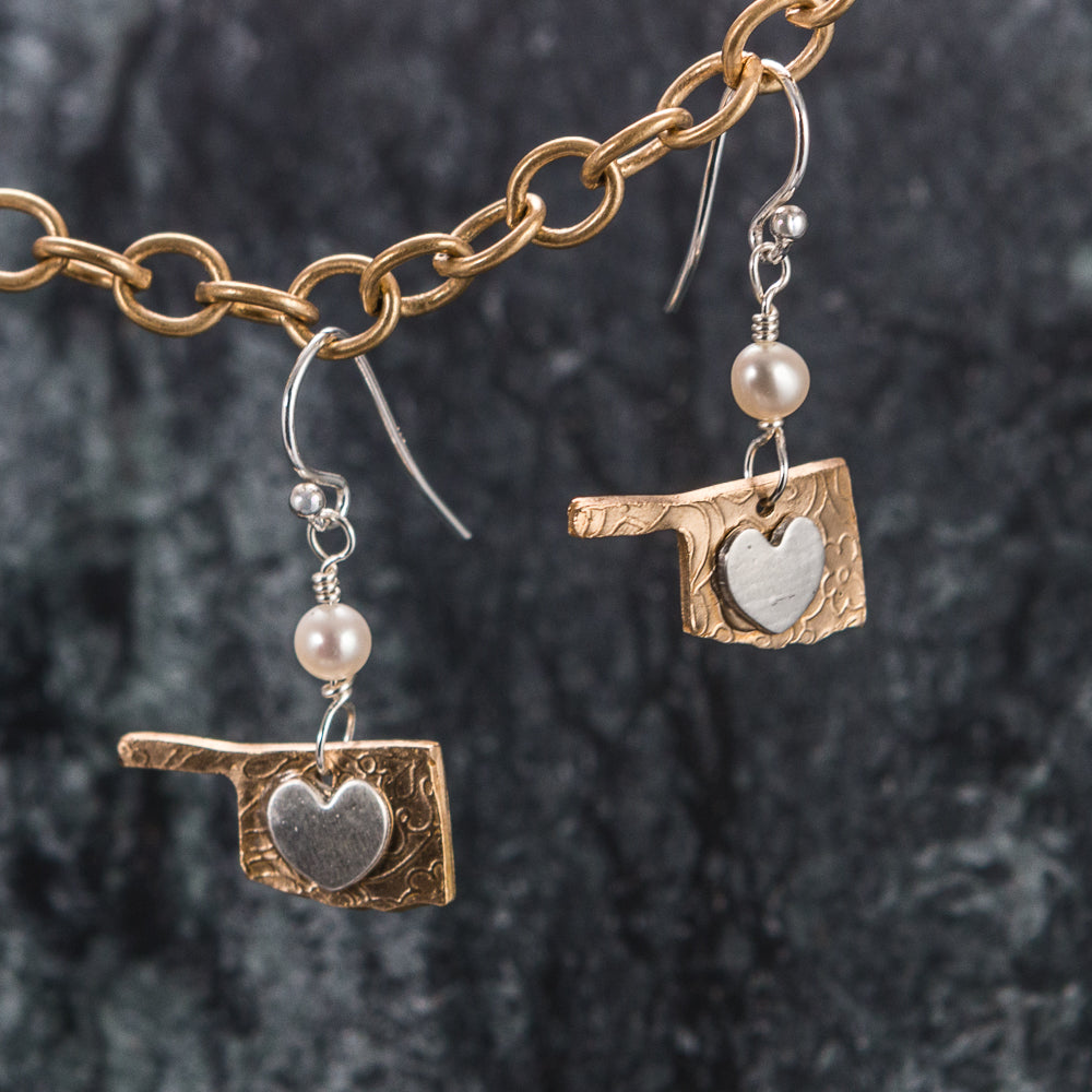 Each earring is composed of a hand stamped Bronze Oklahoma charm (1/2" x 3/8"). These charms were created with Bronze Metal Clay. Following a multi-staged process, the Metal Clay was kiln fired for several hours. The resulting solid bronze charms were then tumbled and hand polished. A Fine Silver (99.9% Pure Silver) heart adorns the front of each charm. These hearts were created with Precious Metal Clay, and the aforementioned procedures were used to make them.