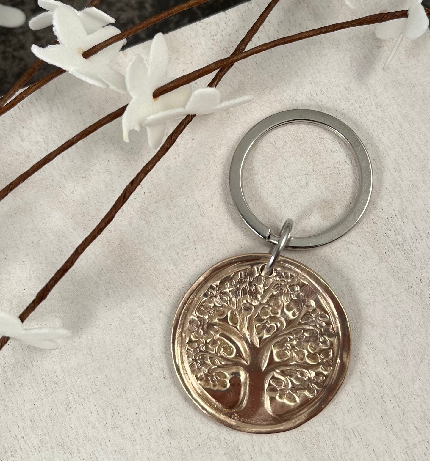 The focal of this pretty Keychain is a handmade Bronze fob. The handcrafted piece measures 1-3/8" in diameter.